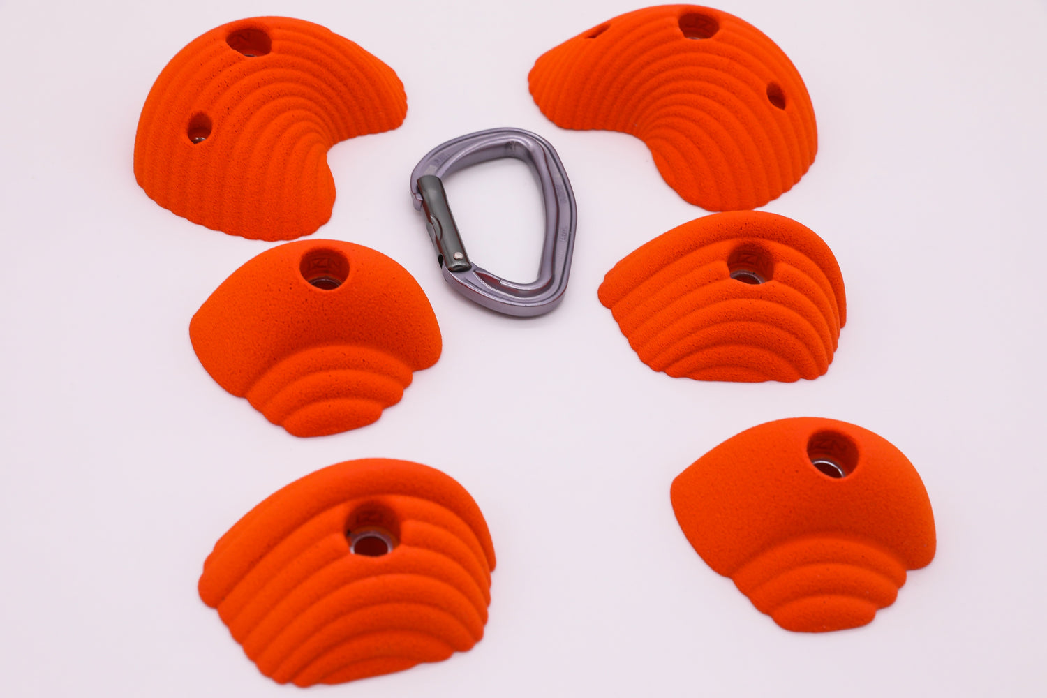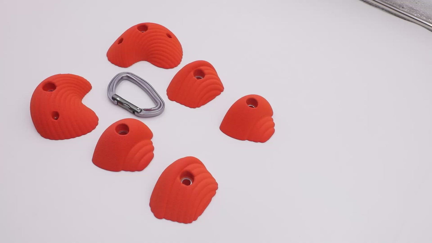 This set includes 6 BOLT ON holds meant to be fastened to your climbing wall using 3/8" Bolts and T-Nuts. Every hold is embedded with steel washers for added strength and durability!