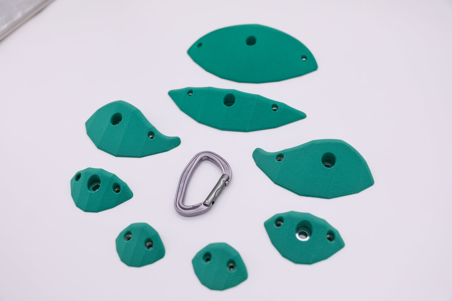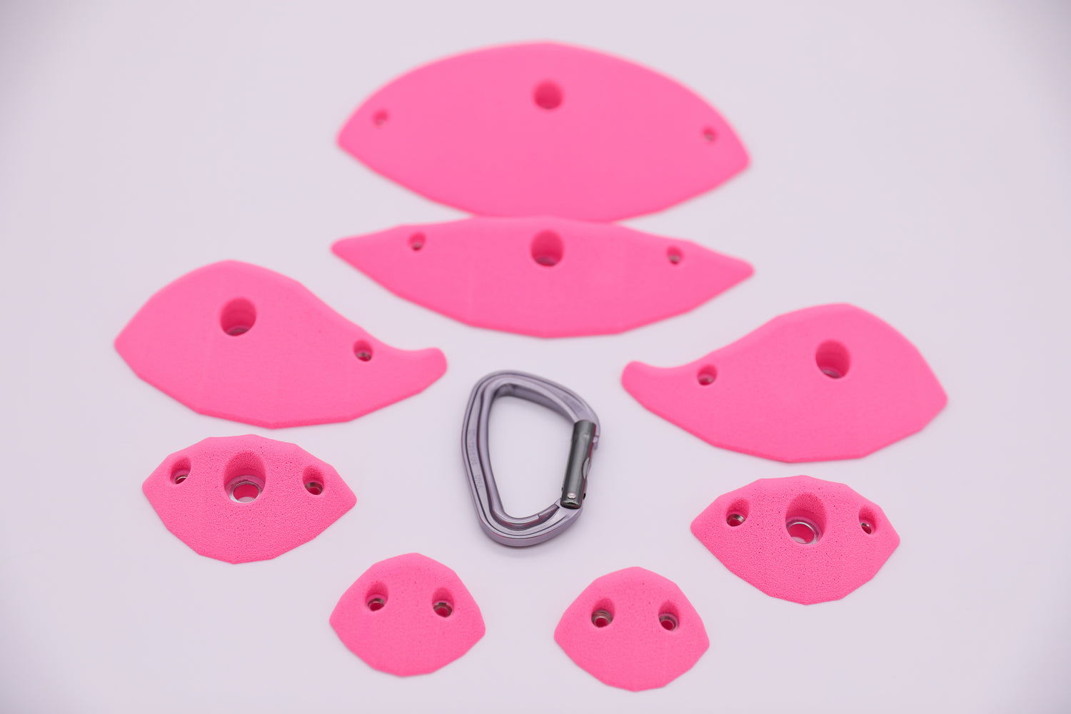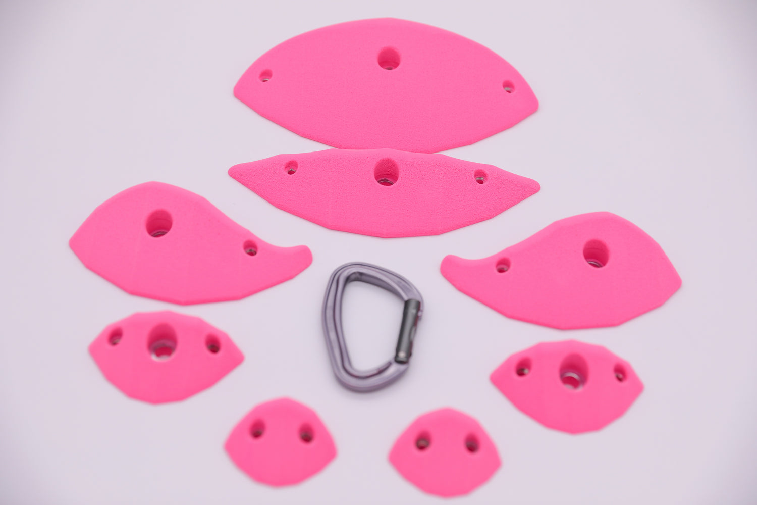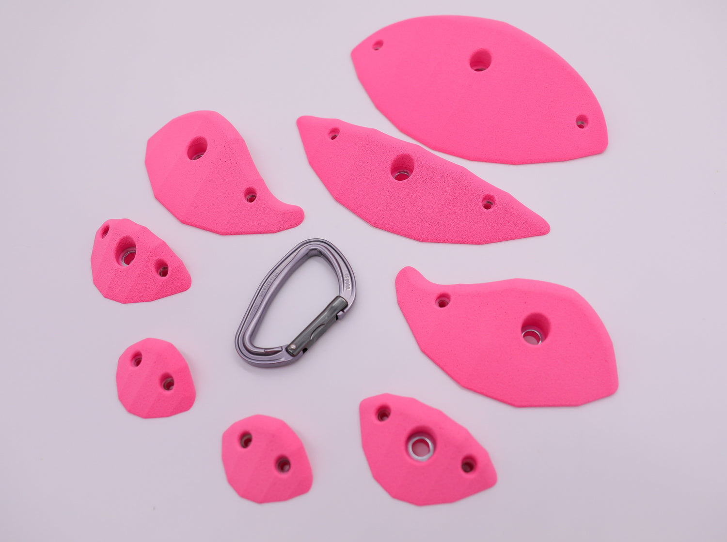 This set includes 2 screw on holds and 6 BOLT ON holds meant to be fastened to your climbing wall using 3/8" Bolts and T-NUTS.